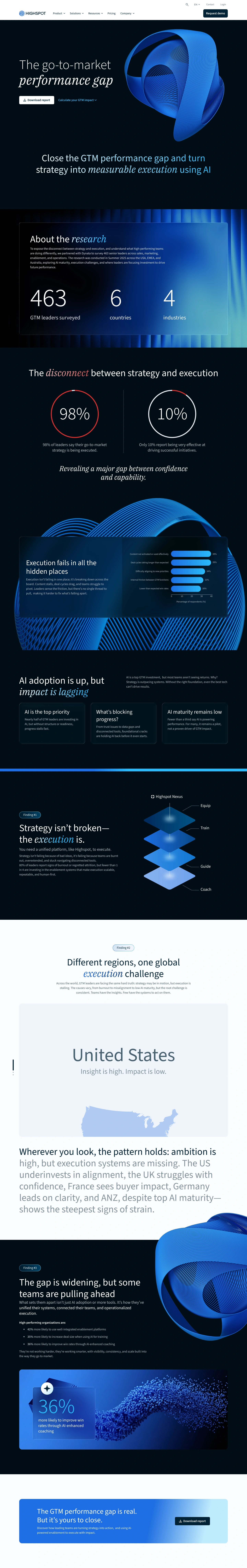 Design a premium, campaign-driven landing page as part of a larger go-to-market initiative focused on the growing gap between AI ambition and execution. The page needed to translate complex research and data insights into a clear, compelling digital experience that resonates with senior revenue leaders. It was expected to function as the central conversion hub for the campaign, integrating storytelling, data visualization, and interactive elements like an ROI calculator to drive report downloads and engagement.