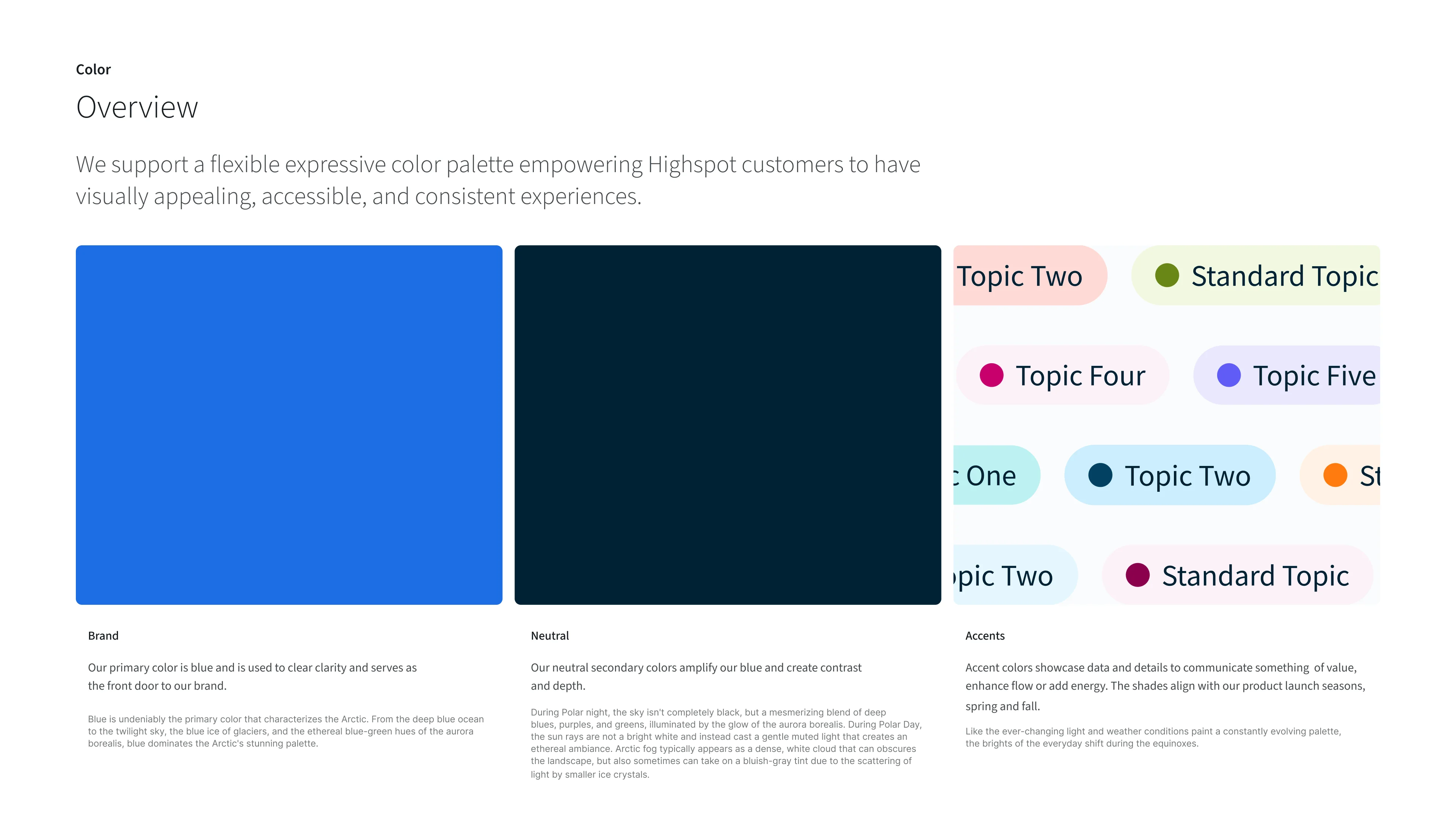 Arctic Flow is Highspot's design language for building beautiful, usable experiences across every product and touchpoint. This initiative brought together the full Expression team in deep collaboration to establish the visual and strategic foundations of the brand, from color and typography to tone of voice and photography, creating a cohesive system built to scale.