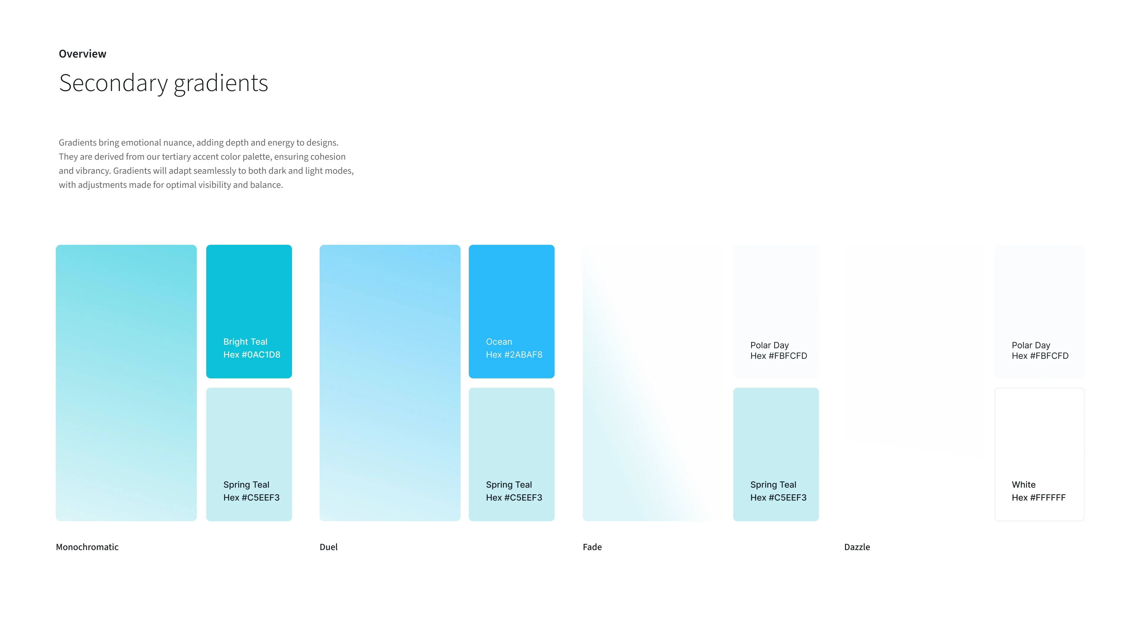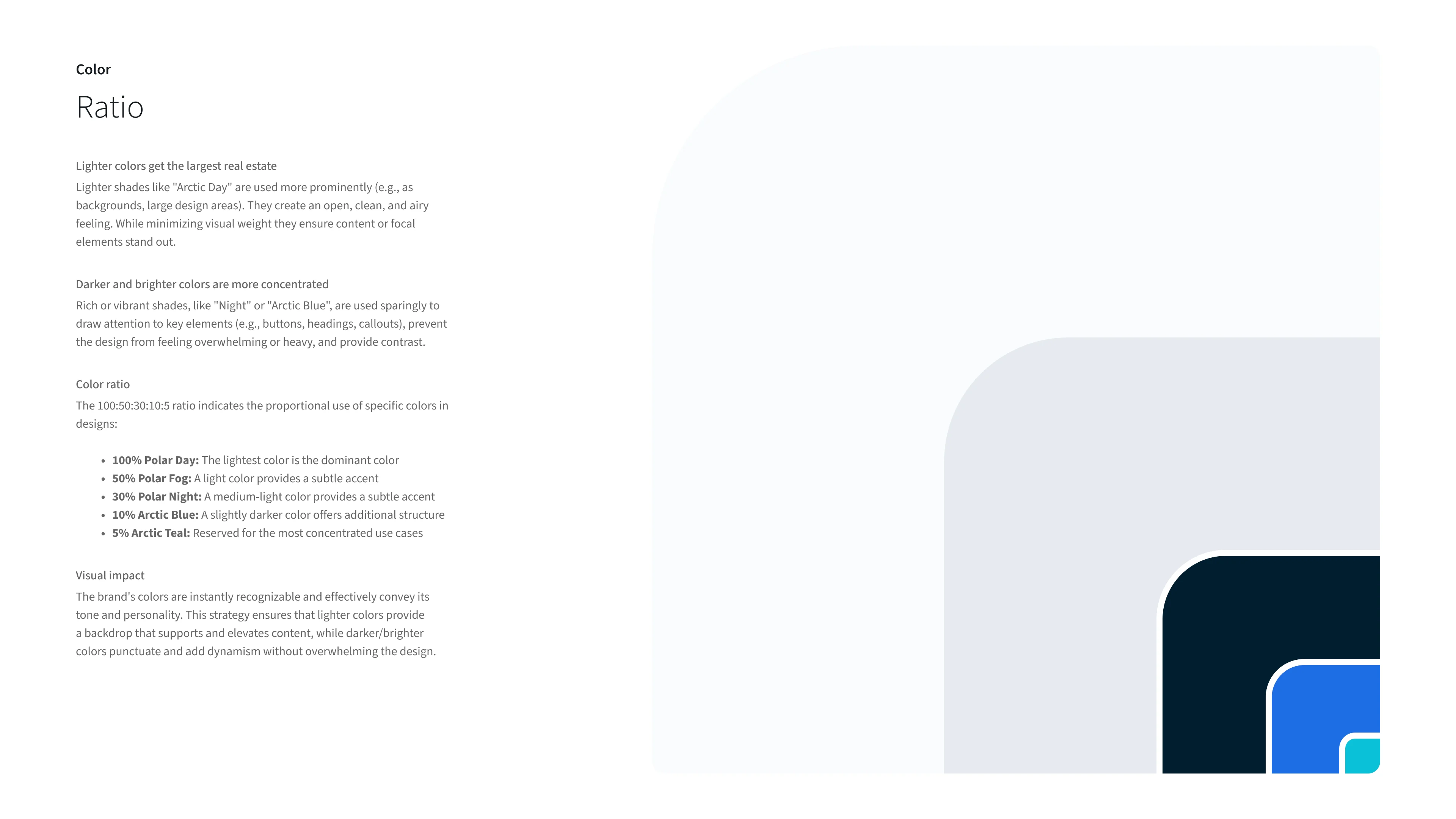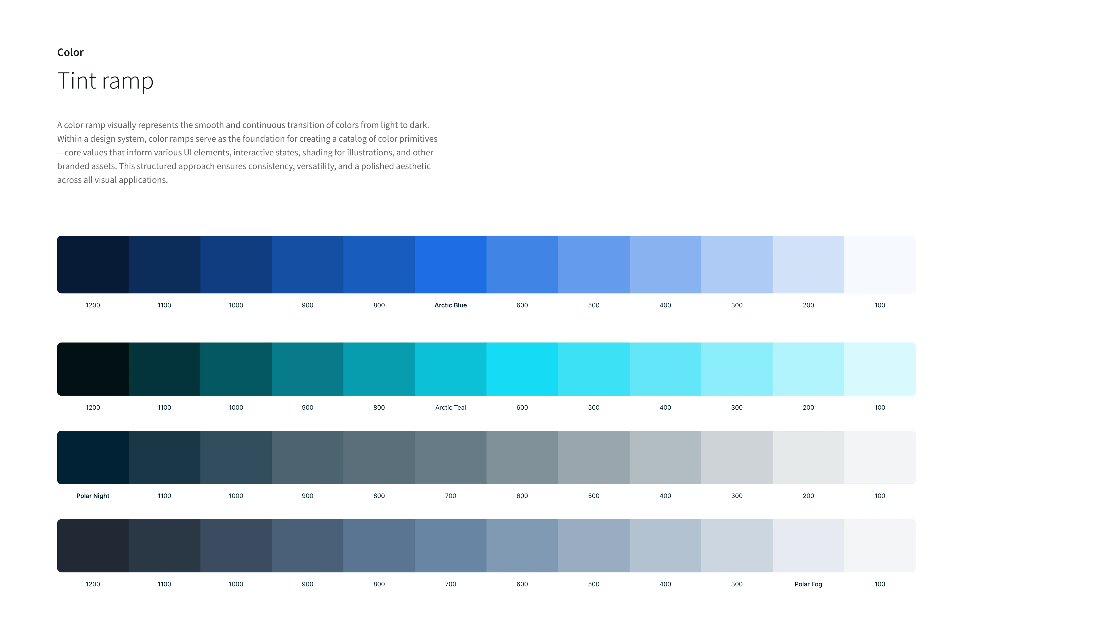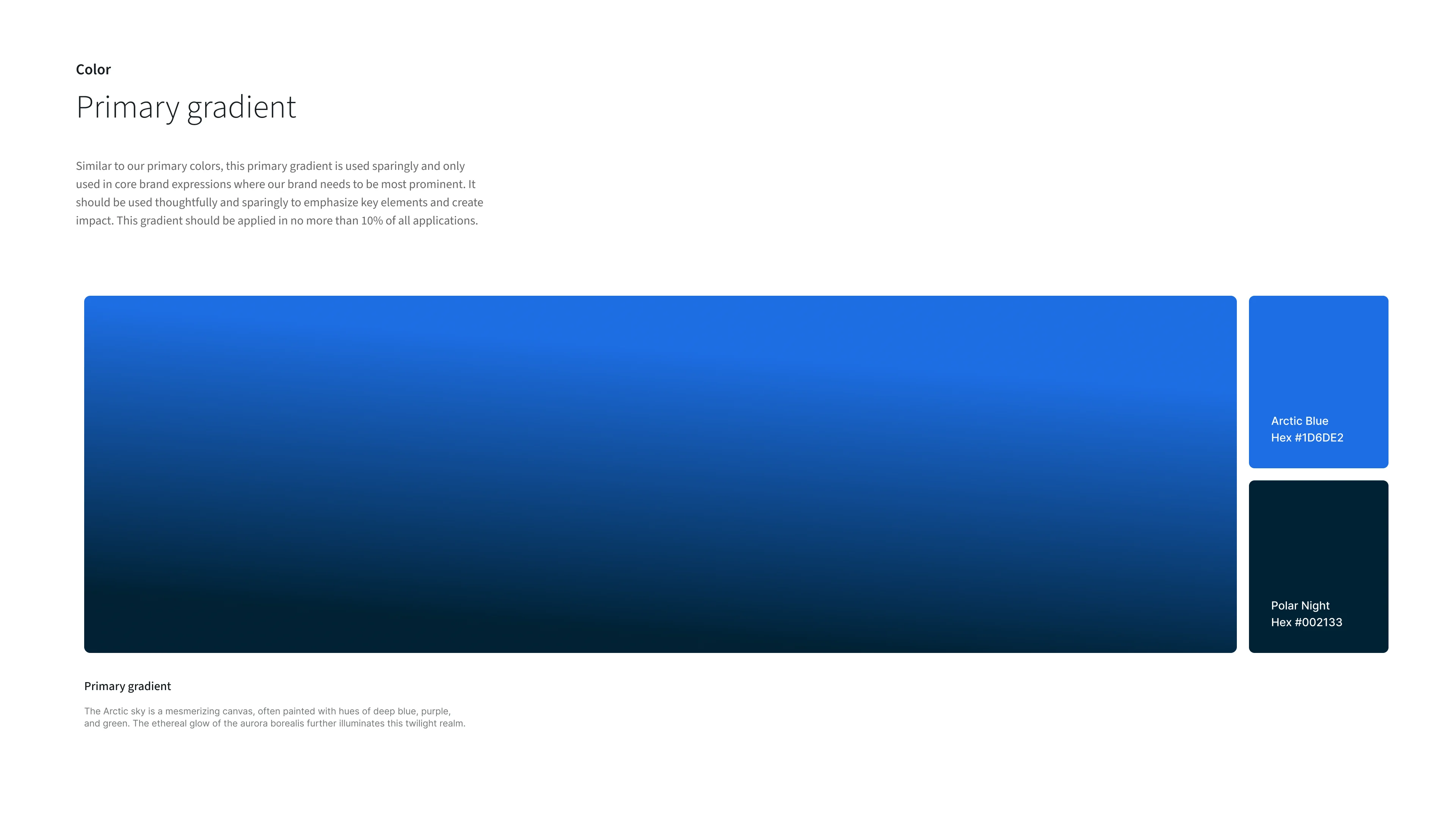 As my primary contribution to the Arctic brand, I owned the full color system, establishing the primary palette, secondary neutrals, tertiary accent colors, tint ramps, and gradients that form the foundation of the visual identity.