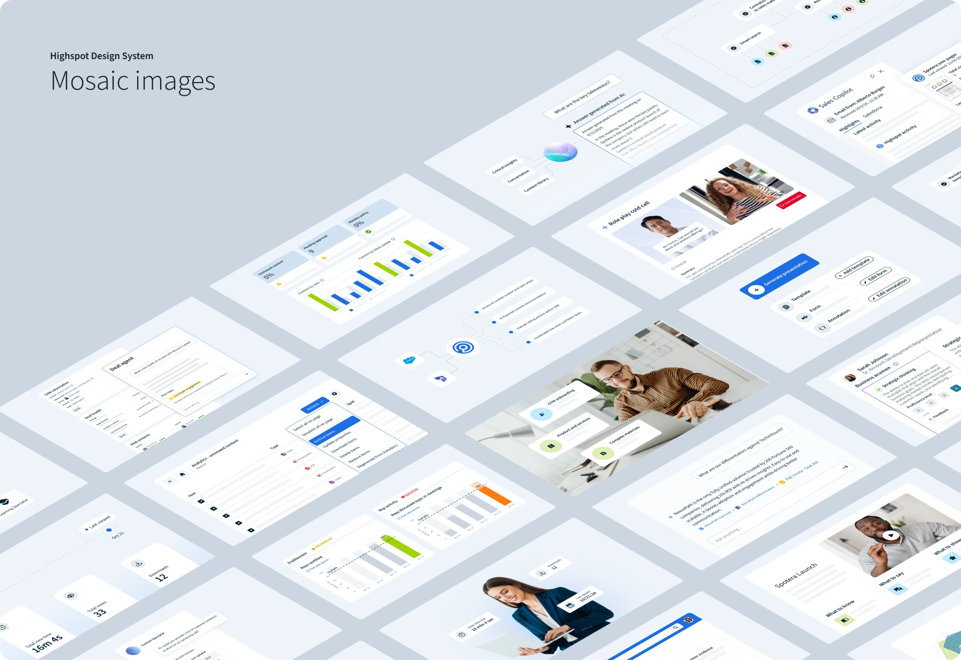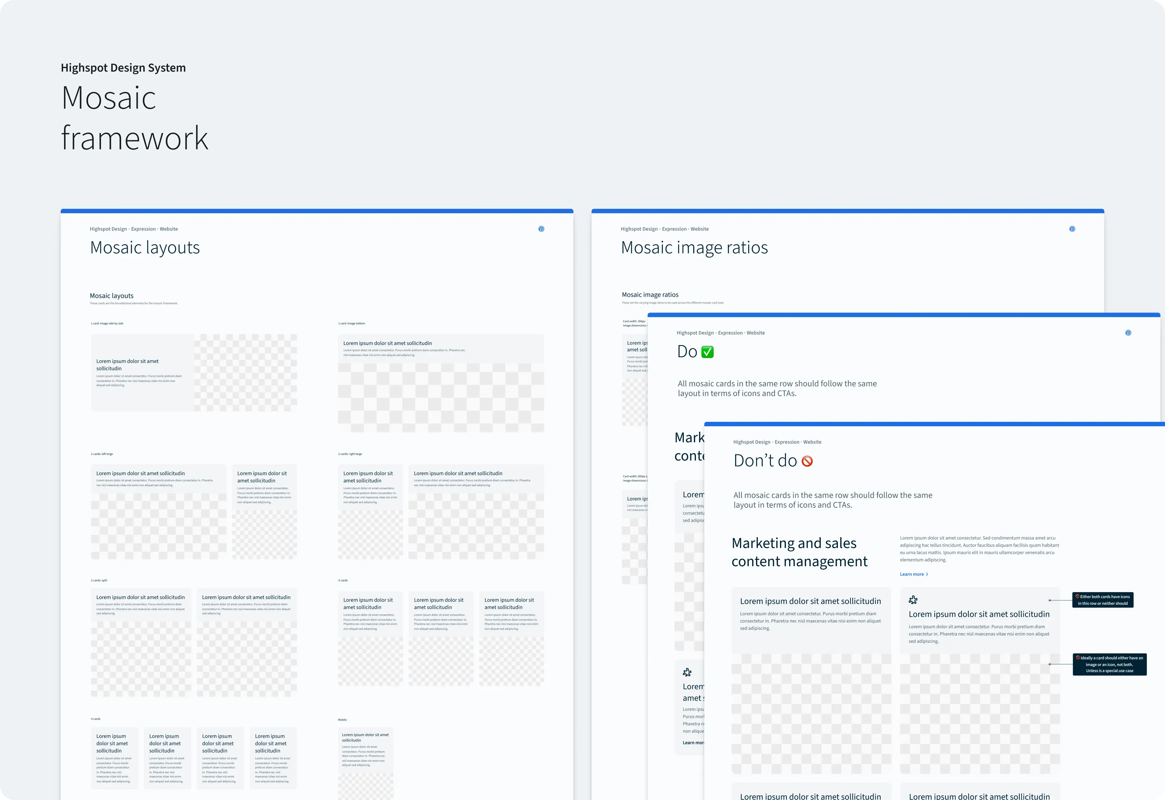 The mosaic layout framework provides a flexible system for consistent content organization across web, email, and datasheets. Built on just six core card types, it enables diverse, story-driven layouts with over a dozen distinct combinations within any 2–6 card sequence.