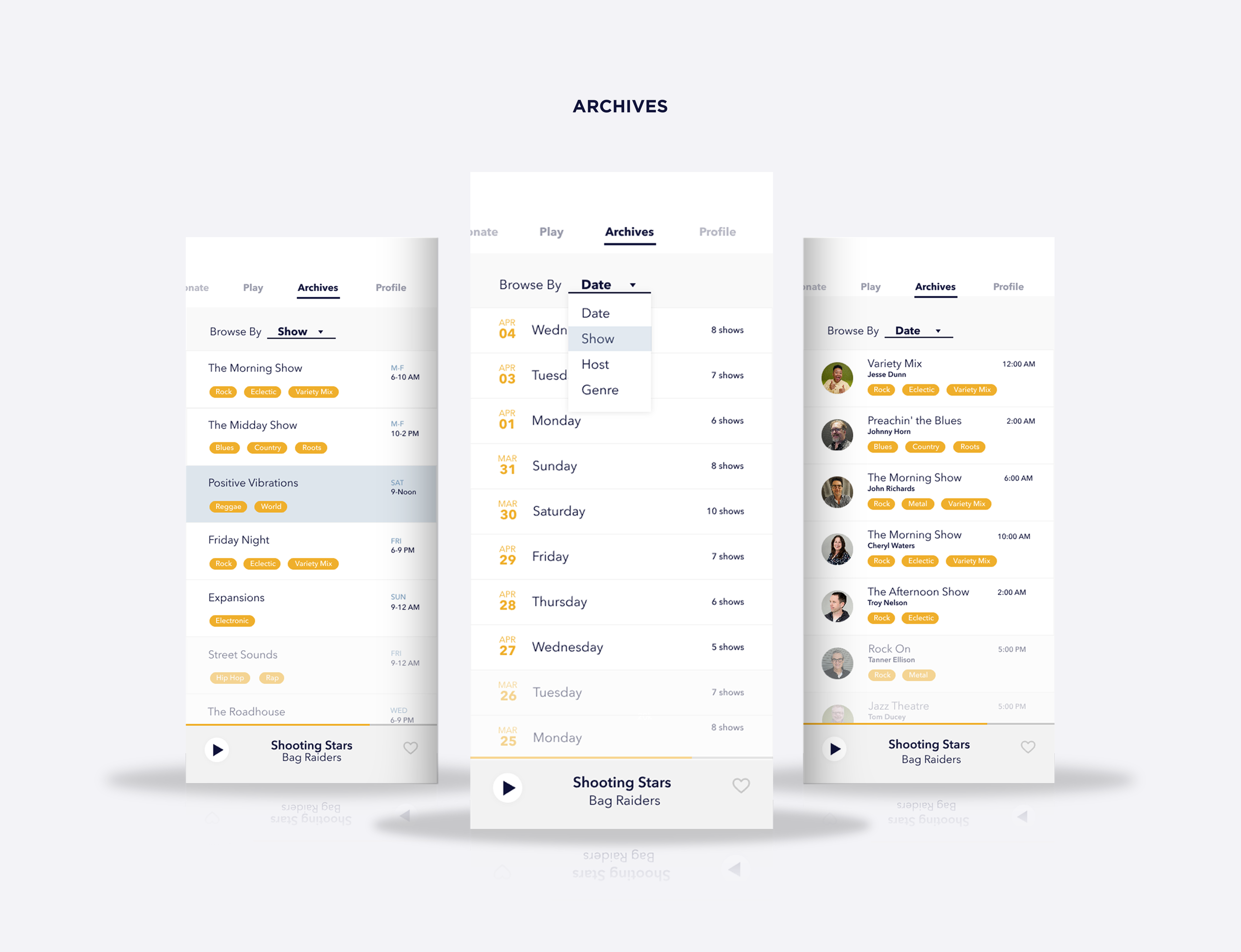 The final designs introduced a clean interface built around horizontal scrolling navigation, a collapsible mini player that keeps listening uninterrupted while users browse, and a streamlined donation flow designed to reduce steps and remove friction for contributors.
